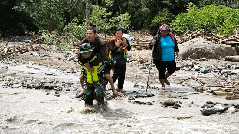 Medan yang sulit, termasuk akses jalan yang terputus total dan penyeberangan sungai, tak menyurutkan semangat para prajurit untuk memastikan keselamatan warga, termasuk seorang ibu lanjut usia (lansia) yang digendong menyeberangi arus sungai.