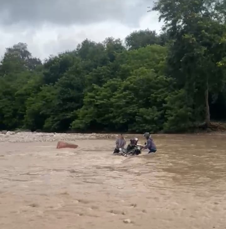 "Pak mau ke mana, jangan langgar dulu karena arus banjir masih deras, nanti saya bantu dorong sepeda motor karena kali penuh banjir," Teriak seorang pria yang diketahui bernama Yakobus dari seberang kali inbate.